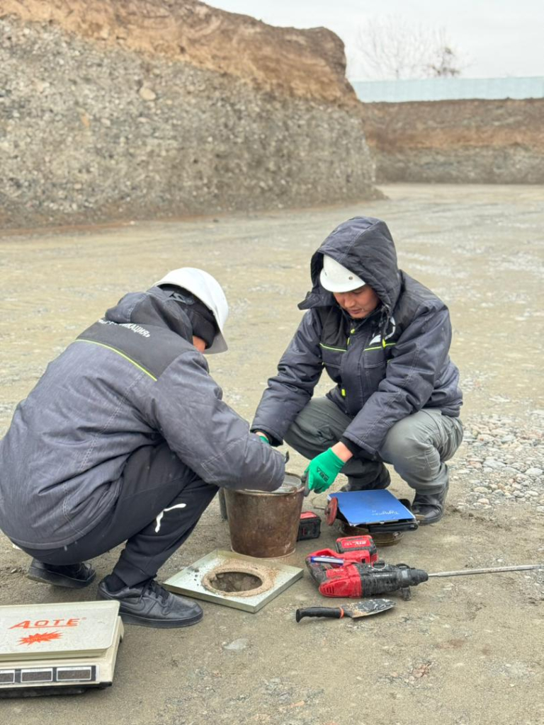 Текшерүү иштеринин жүрүшүндө адистер тыгыздалган топурактын сапатын белгиленген ченемдик талаптарга ылайык аныктоо максатында топурактан үлгүлөрдү алышты.